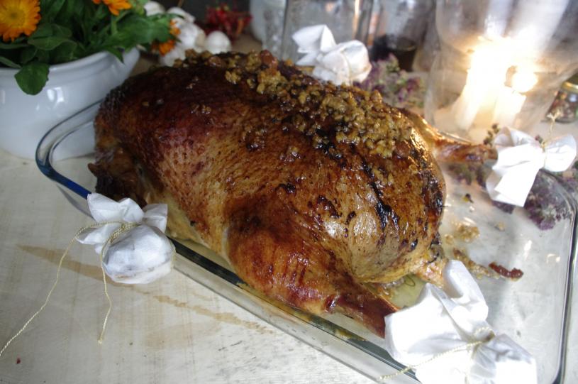 Gęś przed pieczeniem powinna być zamarynowana. Najlepiej jak zrobimy to dzień wcześniej. Nacieramy ją solą, pieprzem, majerankiem, cząbrem, czosnkiem. W trakcie pieczenia podlewajmy gąskę wytopionym tłuszczem i winem, a pod koniec niewielką ilością wody z miodem. Pieczemy gąskę nadziewaną kaszami: gryczaną, jaglaną i orkiszową z cebulką, grzybami, rodzynkami, jabłkami i żurawiną.